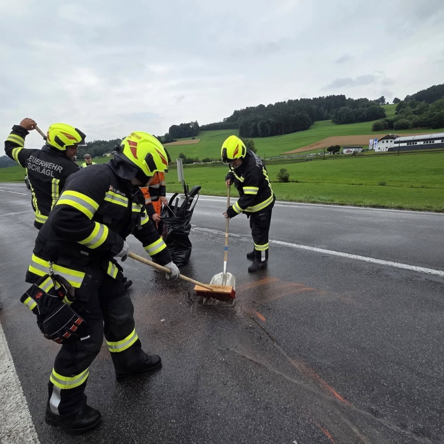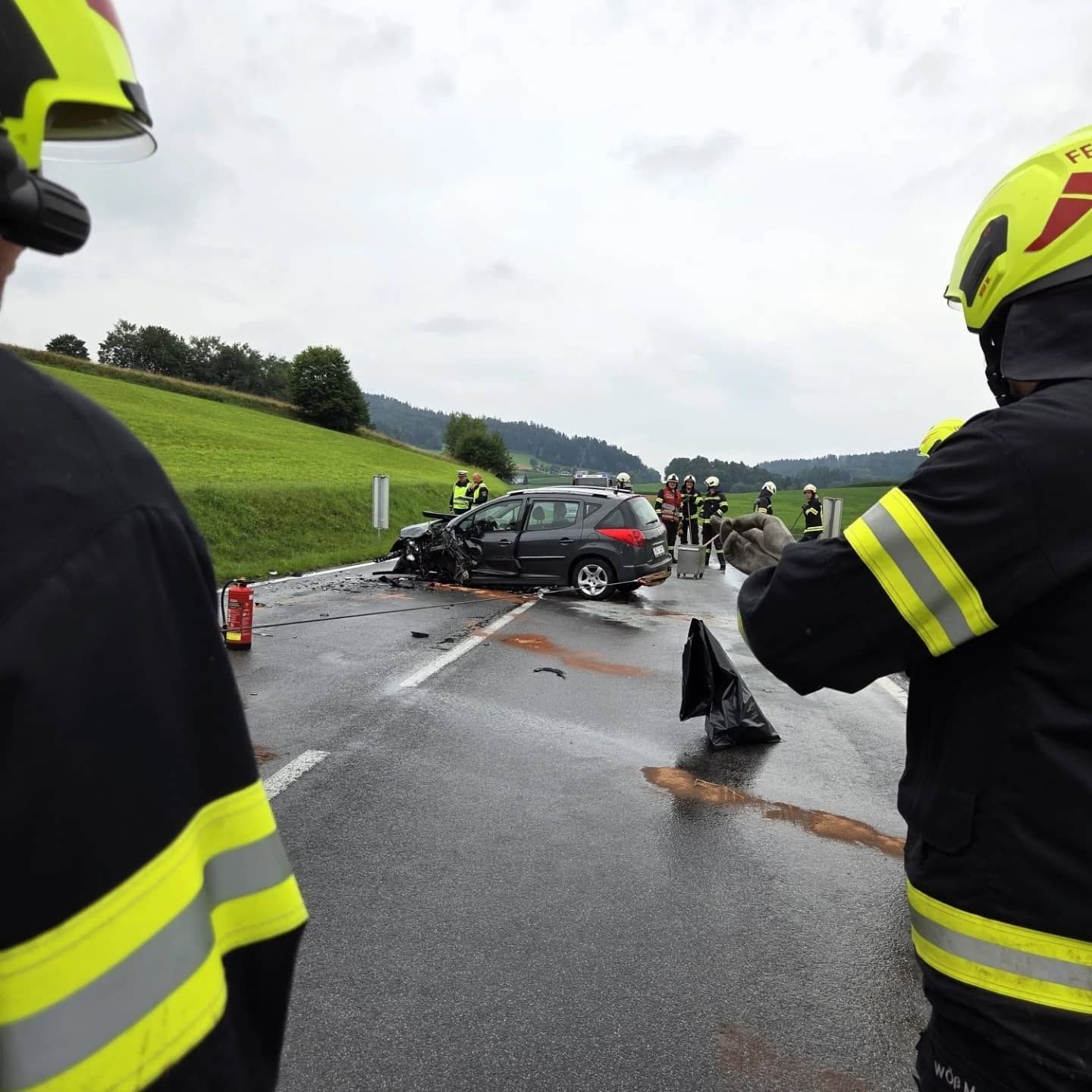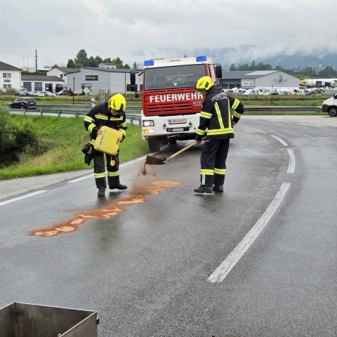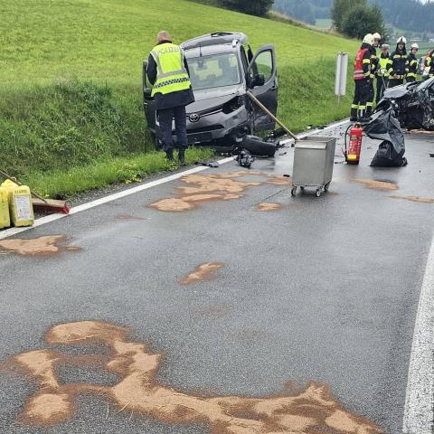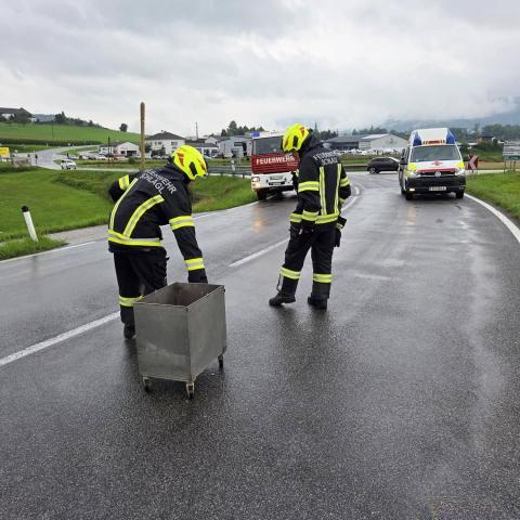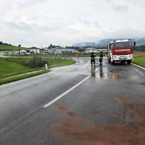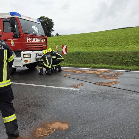 Vor Ort stellte sich glücklicherweise heraus, dass niemand eingeklemmt war. Die FF Aigen konnte daraufhin wieder einrücken. Gemeinsam mit der FF Oepping wurden die ausgelaufenen Betriebsmittel gebunden. Anschließend führten wir die Aufräumarbeiten durch, entfernten Kleinteile von der Fahrbahn und zogen ein Unfallfahrzeug mithilfe der Seilwinde über die Anhängerkupplung zurück, um eine Fahrspur wieder freizugeben. Danach wurde die Straße mit Ölspurtafen gesichert.