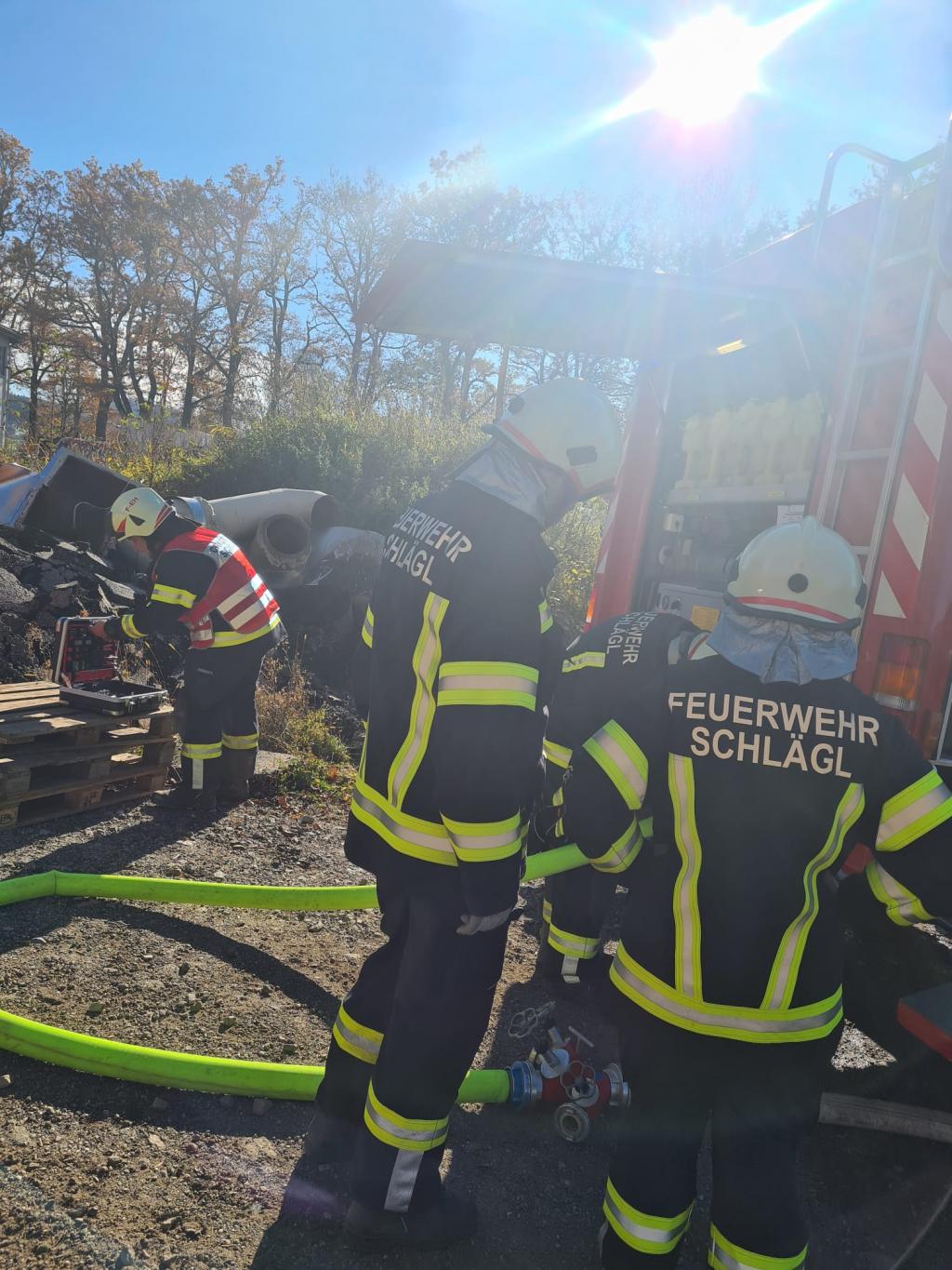 Übungsannahme war für uns ein Brand in der Bioenergie in Aigen-Schlägl mit zahlreichen vermissten Personen im Gebäude. Außerdem galt es weitere Aufgaben, wie eine Personenrettung aus einem Schacht und einem Verkehrsunfall abzuarbeiten.