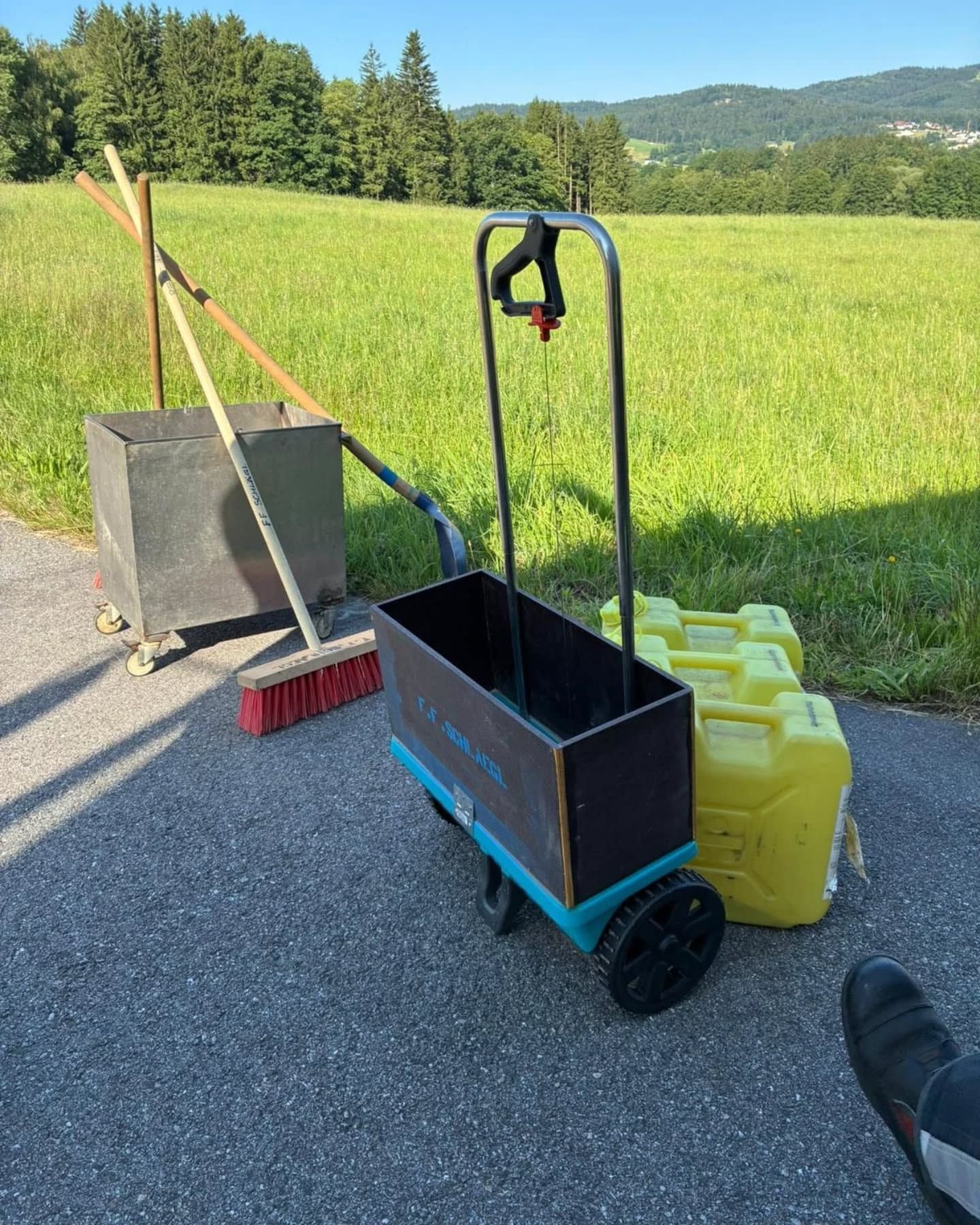 Der Platz wo das Auto stand wurde gründlich gereinigt ud die Ölreste sorgfältig entfernt. Zur Warnung anderer Verkehrsteilnehmer stellten wir Ölspurtafeln auf.