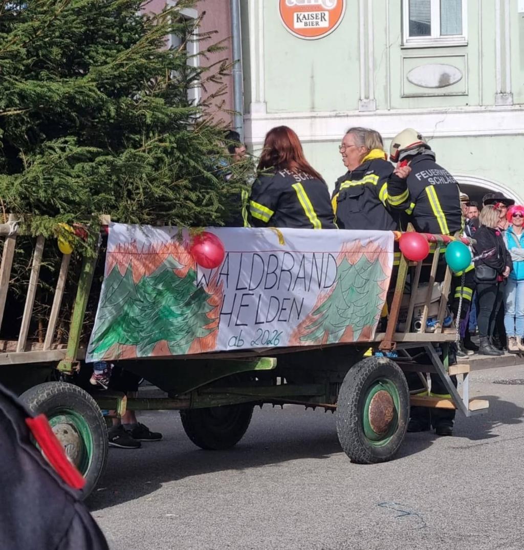 Wenn die Feuerwehr mit Blaulicht und Sirene durch die Straßen zieht, brennt es - zumindest fast! Beim diesjährigen Faschingsumzug am 04. März 2025 in Aigen-Schlälg haben wir uns einem wichtigen Zukunftsthema gewidmet: unserem neuen Waldbrandfahrzeug, das 2026 in Dienst gestellt wird. Passend dazu lautete unser Motto, das auf unserem Banner zu lesen war: "Waldbrandhelden ab 2026"