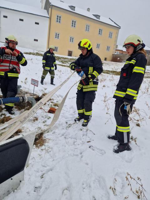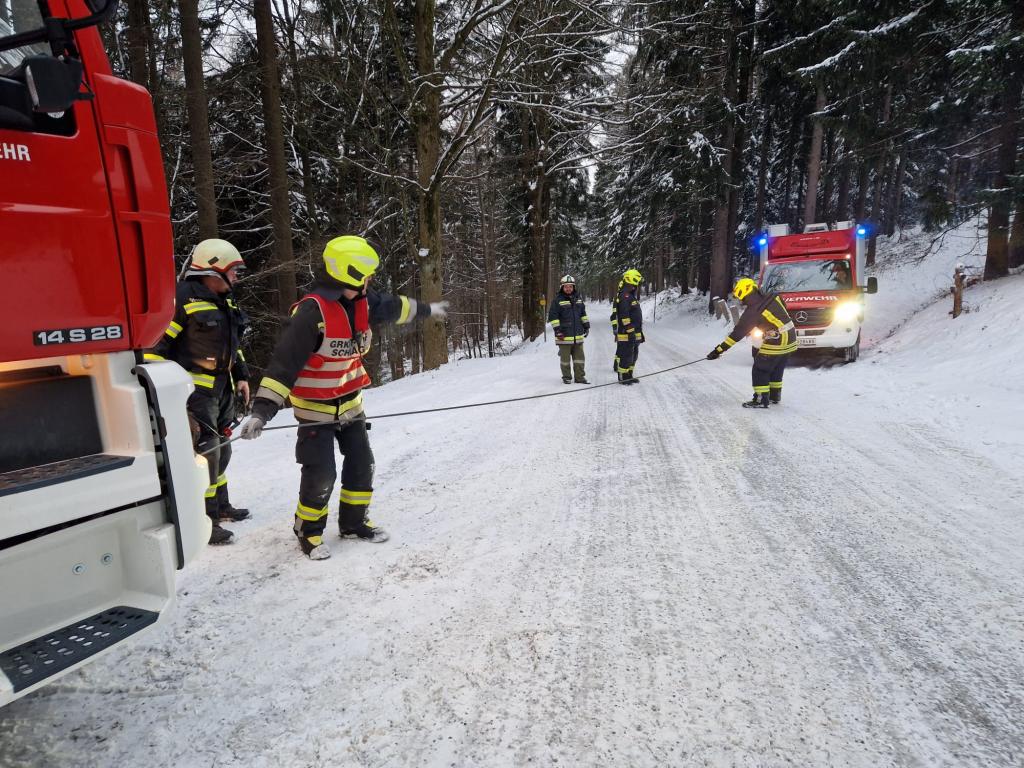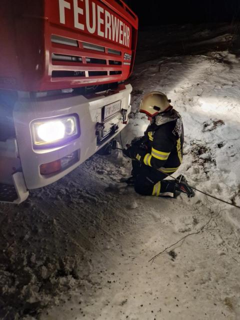 Nachdem wir zur Unterstützung beim Ereignishaus Holzschlag nicht mehr benötigt wurden, fuhren wir sofort weiter Richtung St. Oswald, wo wir mittels Seilwinde einen LKW bergen mussten. Zeitgleich wurden die Feuerwehrhäuser des Abschnitts Stromlos gemacht, um eine Black-Out Situation zu Üben.