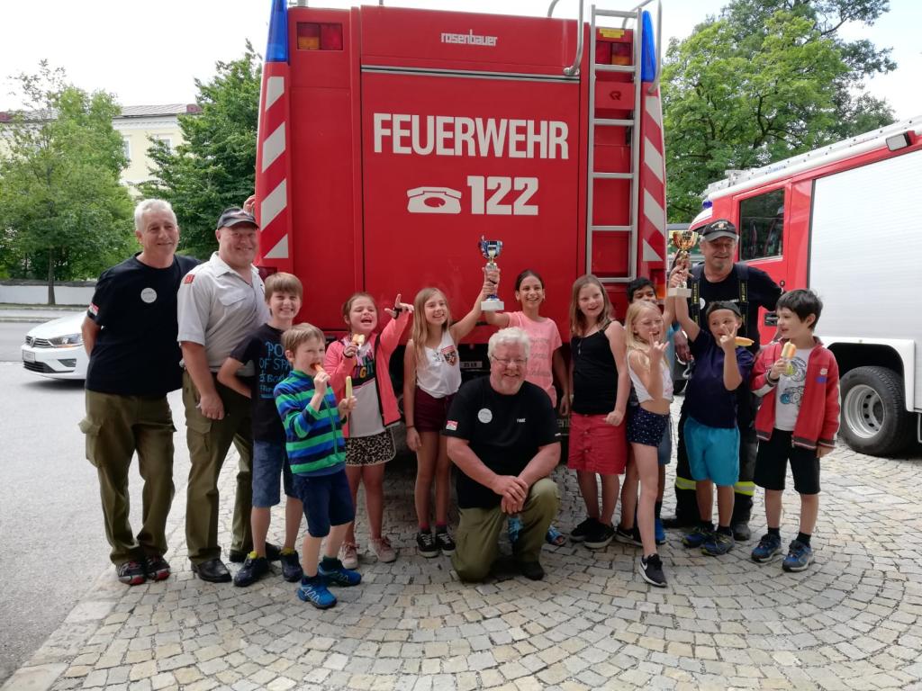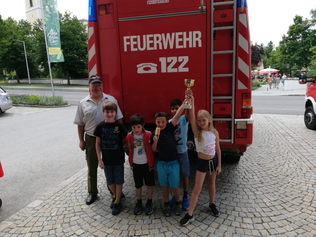 Am 10.Juli 2019 organisierten wir bei uns einen Vormittag bei der Feuerwehr für den Hort von Aigen-Schlägl. Es wurden die Feuerwehrautos samt Inhalt zur Schau gestellt und erklärt. Außerdem kam die "Kübelspritze" zum Einsatz, es gab einen Wettkampf beim "Feuerwehrschlauchfüllen" und andere Wettkämpfe. Bei der Siegerehrung wurden beide Gruppen mit einem Pokal ausgezeichnet und mit einer Runde Eis belohnt. Natürlich wurde bei dem perfekten Sommerwetter ein "Schaumteppich" aufgesprüht. Der Vormittag wurde durch Fahrten mit unseren Feuerwehrautos abgerundet.